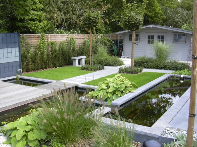 folie of prefab, type pomp, filtering, beplanting, stenen of houten oeverafwerking.